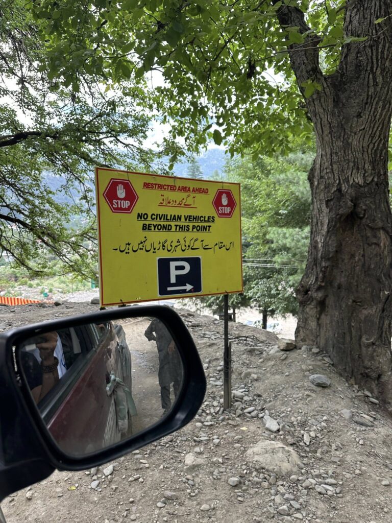As we neared the final army post, the network dropped completely. Our host was meant to meet us near the last checkpoint, but communication was impossible. At the barricade, we were stopped. A sign read: “No civilian vehicles beyond this point.”