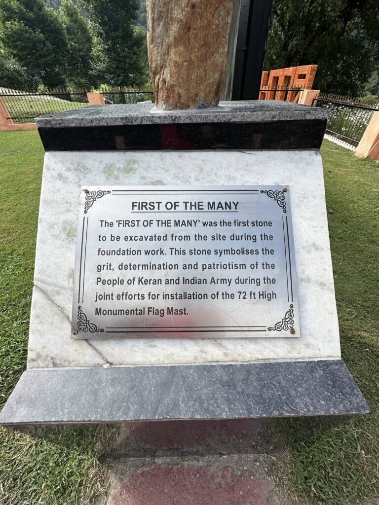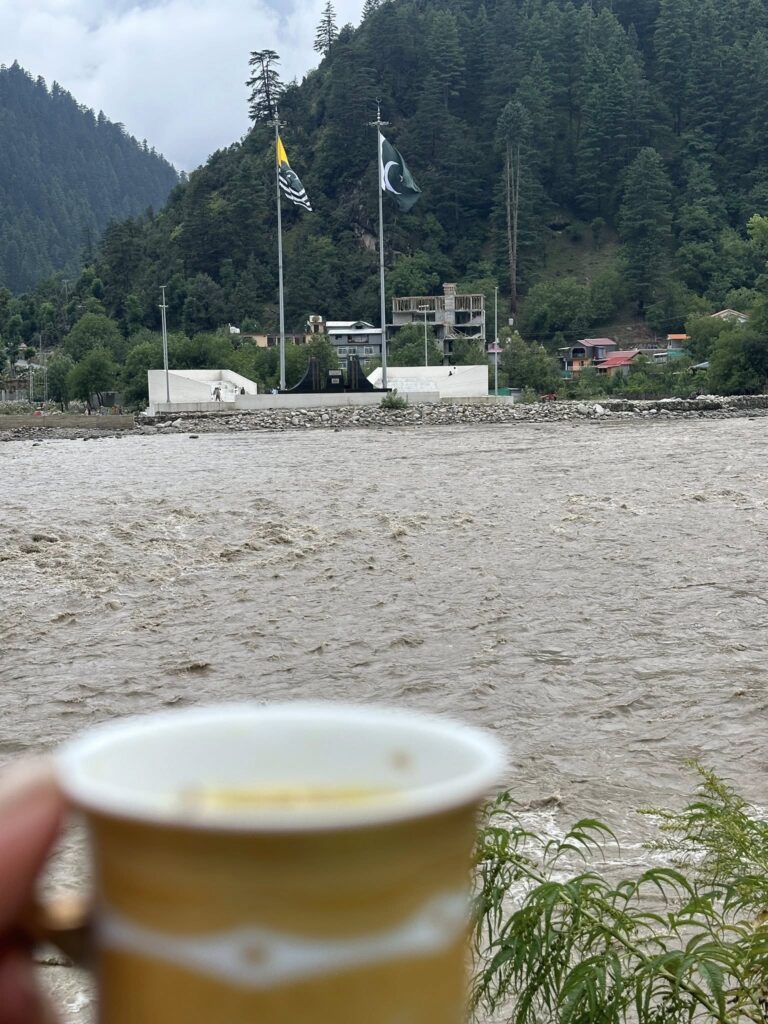 Right in front of the guesthouse flowed the Kishanganga. Barely 100 meters across, on the other side, lay Pakistan-Occupied Kashmir. We could clearly see both flags—the Pakistani national flag and the Azad Kashmir flag—fluttering side by side. The river they call Neelam and we call Kishanganga felt both a divider and a mirror. An island sat between the two streams, as if nature itself understood the weight of history here.
