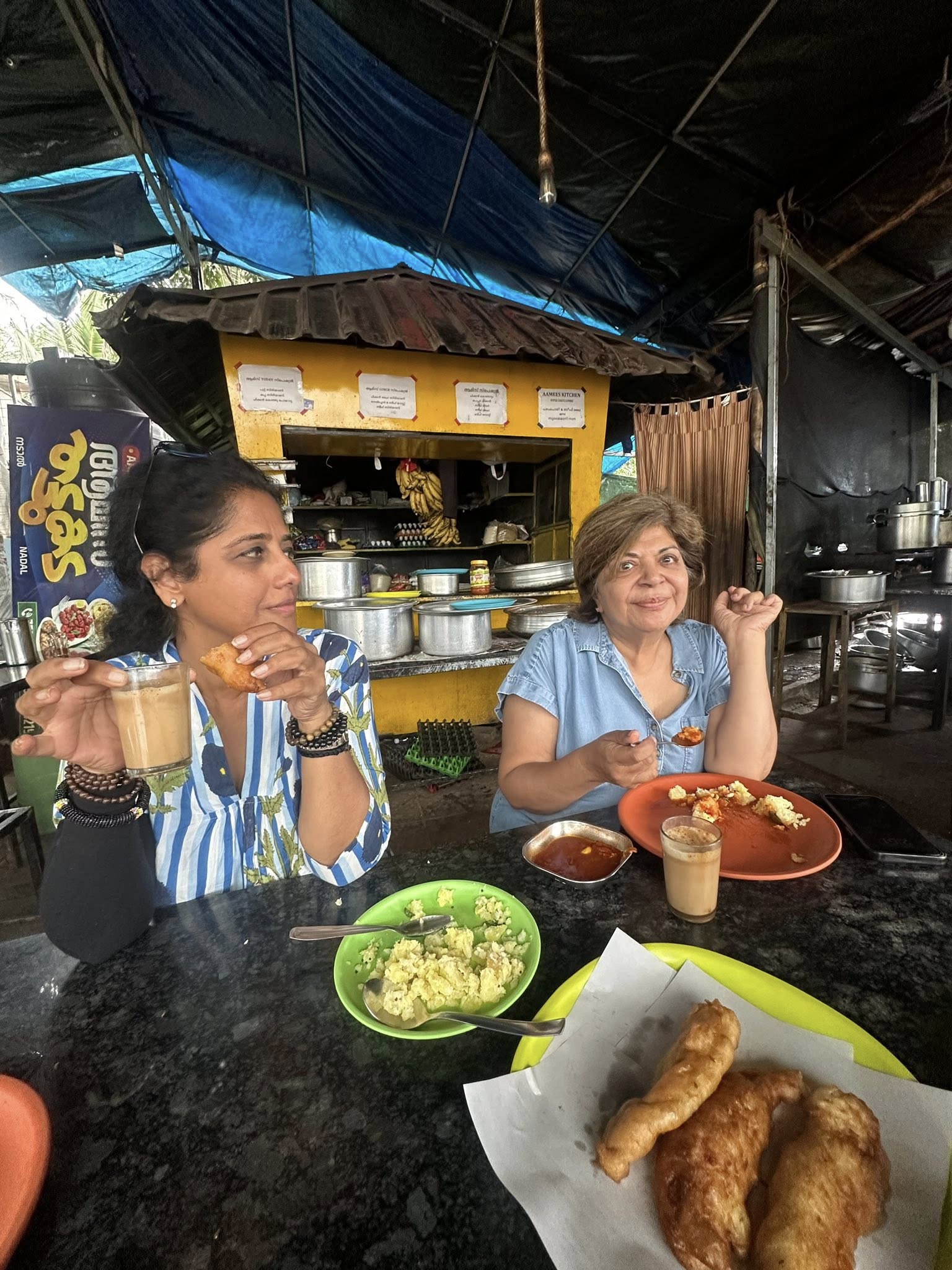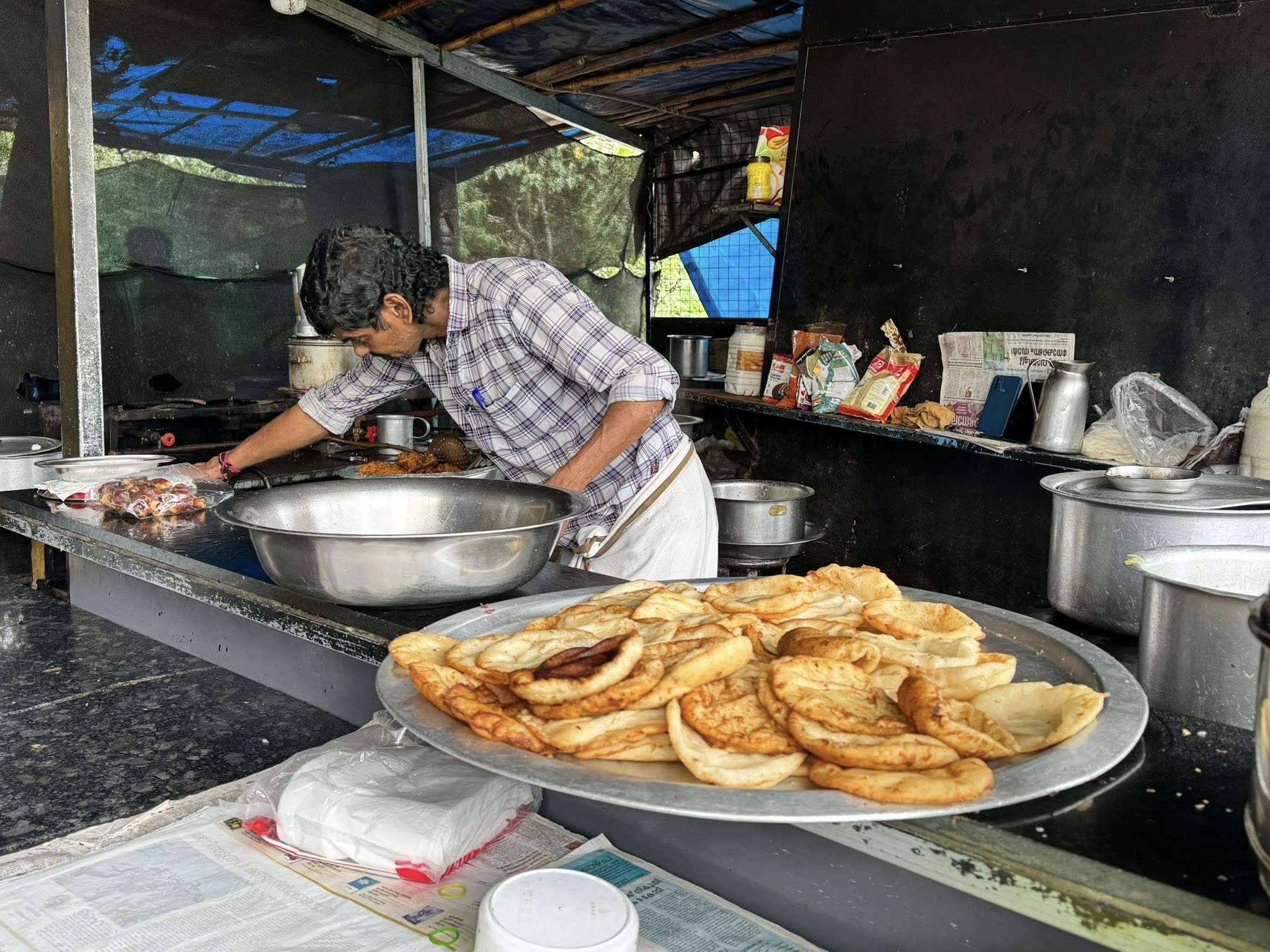 Lunch was at a small roadside eatery—palamburi, kappa, parotta, the works. It was pouring outside, and inside, three women in a sea of men drew curious stares. But the food was delicious, and we were soon back on the road.