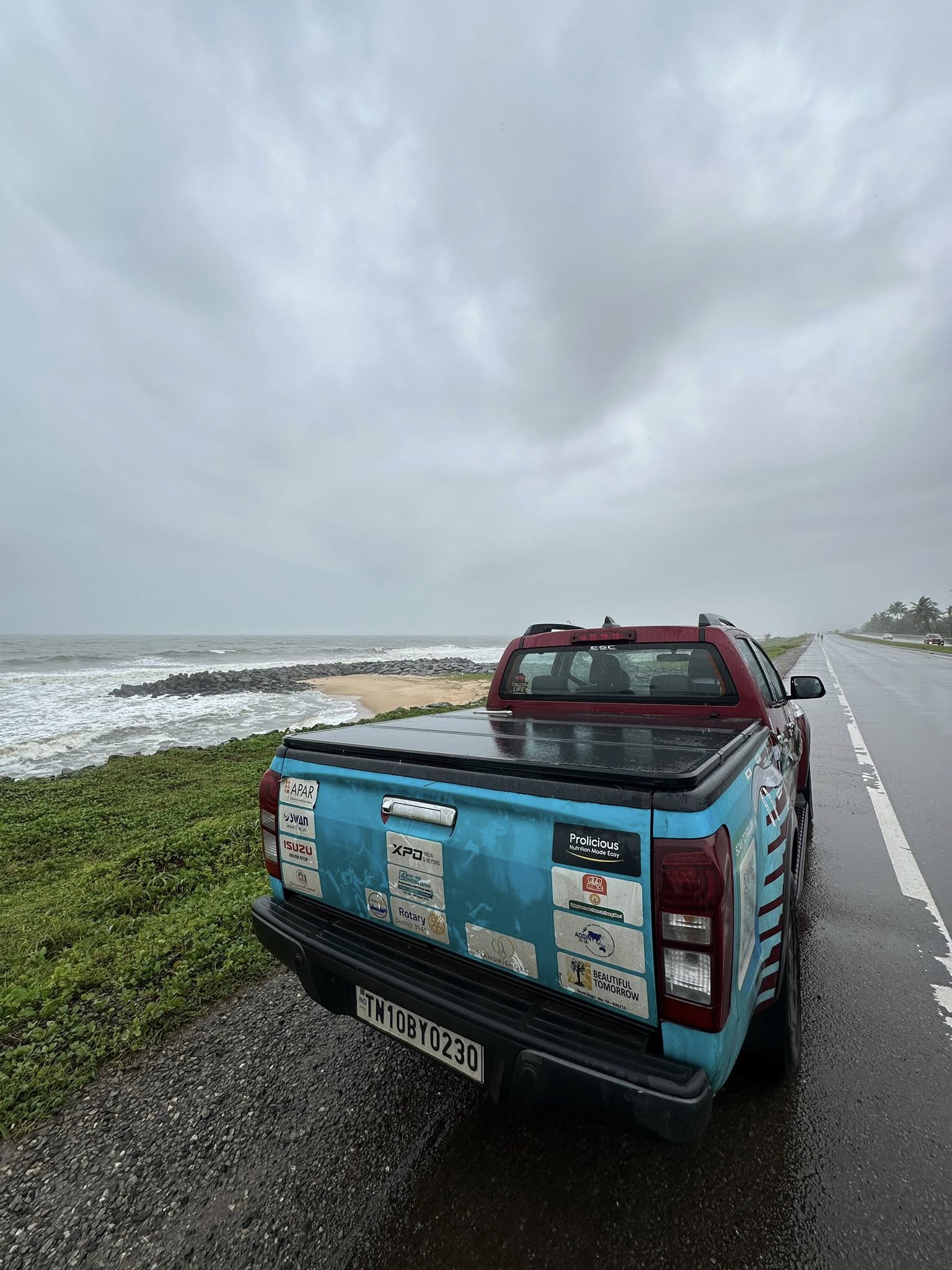 The terrain today was beautiful. Karnataka is a gem—much like Kerala—with its endless water bodies and vibrant landscapes. We even stopped at Maravanthe Beach, that picture-perfect stretch where the sea runs parallel to the backwaters, hoping to fly the drone. But the rain came down hard, and the police quickly shooed us away. A drone shot here would have been spectacular, but like yesterday, the beach plans were washed out.